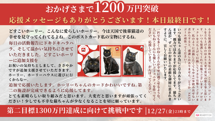 本日最終日で23時までの挑戦となっておりますが、おかげさまで1,200万円を突破し、ネクストゴールの1,300万円も達成が手に届くところまできました。