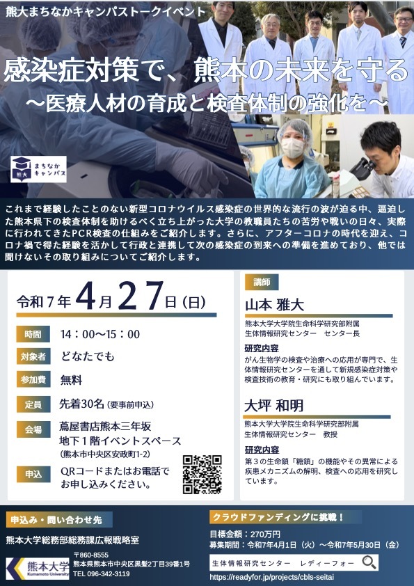 | トークイベント | 「感染症対策で、熊本の未来を守る〜医療人材の育成と検査体制の強化を〜」 熊本大学大学院生命科学研究部附属生体情報研究センター センター長 山本雅大 教授 大坪和明 |