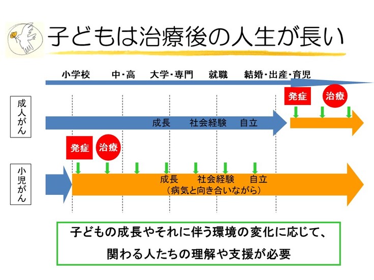 子どもの人生は治療後も長く続くため、進学や就職・結婚などのライフイベントがある中で、再発や二次がんといった小児がんの経験と向き合う事になります。患者と時間を共にする家族にも長く負担がかかるため、どちらの視点の相談にも対応し、総合的に支援できる機関が必要です。