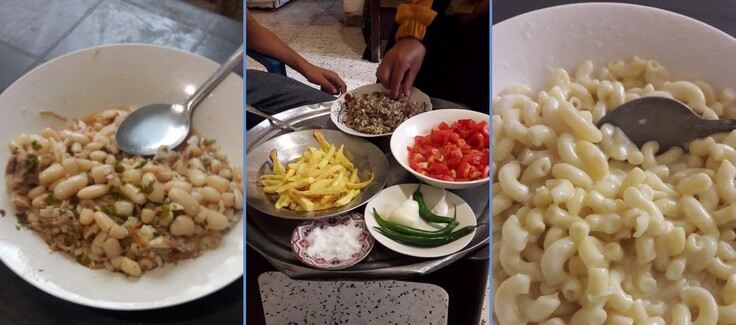 難民キャンプに住んでいる人々は、これまでも質素な食生活をしている人が多く、豆類やジャガイモ、野菜、パン、お米、マカロナ(パスタ)などを主に食べています。マカロナはヨーグルトやトマト、調味料で味付けしただけで、具が入っていないことがほとんどです。動物性たんぱく質は、鶏肉や卵でさえも高くてなかなか買うことができません。夏場は地中海で魚を採ってきた人から分けてもらったこともあったようです。野菜や果物も以前より値上がりしてしまいました。