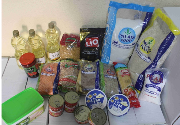 食料パッケージには、現地の人々の食生活に欠かせない米、パスタ、油、砂糖、豆類、肉缶、魚缶、チーズ、トマトペースト、紅茶などを入れました。