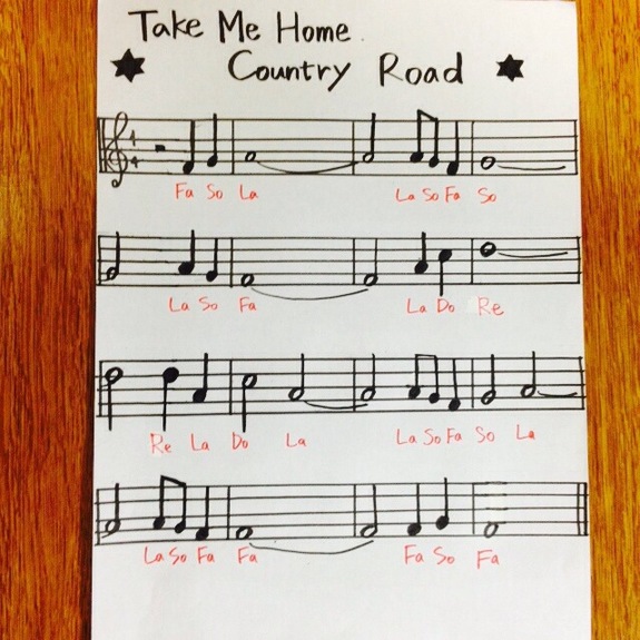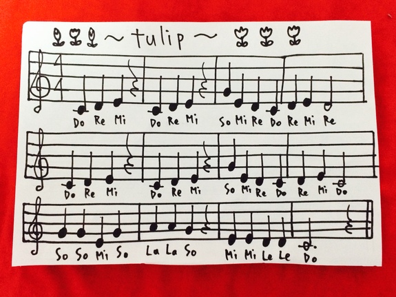 このように手作りで楽譜を作り、英語で音名を書くなどの工夫もしています。