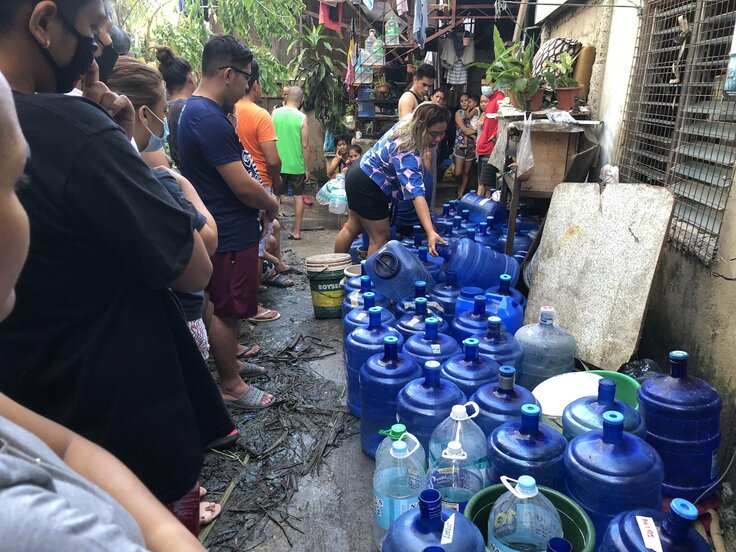 (断水しているために水を手に入れるにも暑い中長時間並ばないといけません。)