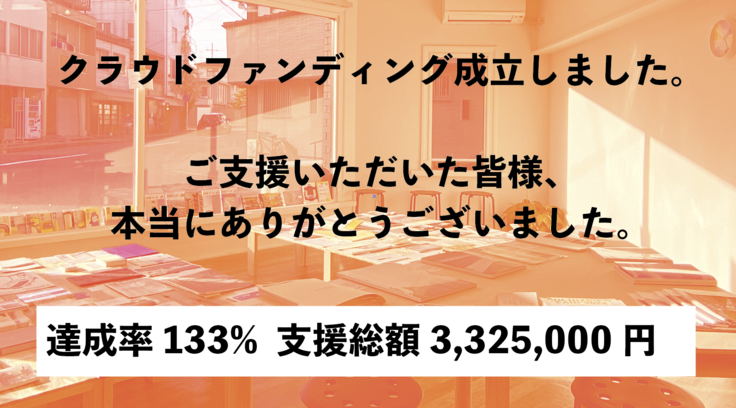 おかげさまで5月12日23時をもちまして、クラウドファンディング「建築文化を「案内」するプラットフォーム=建築センターを京都につくる」は、目標金額の250万円をこえ、247名の方々から3,325,000円(達成率133%)のご支援いただき成立いたしました。ご支援いただきましたみなさま、本当にありがとうございます。心より御礼申し上げます。
