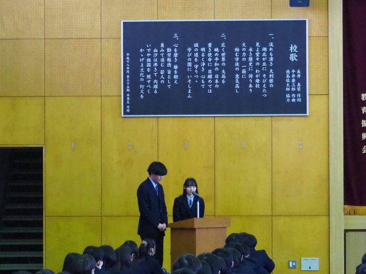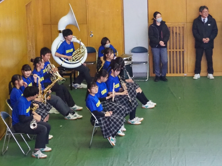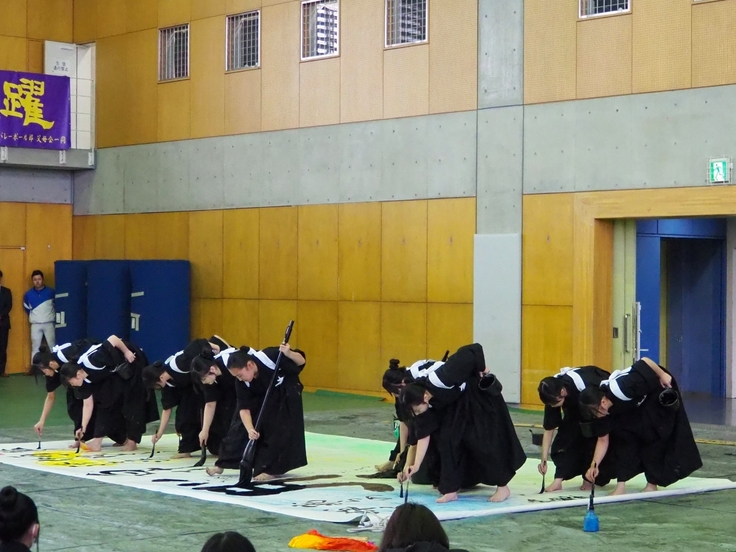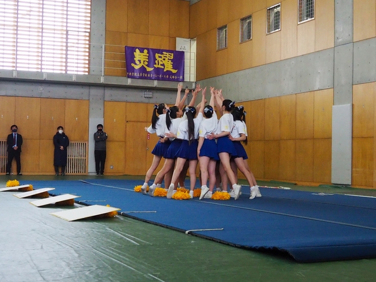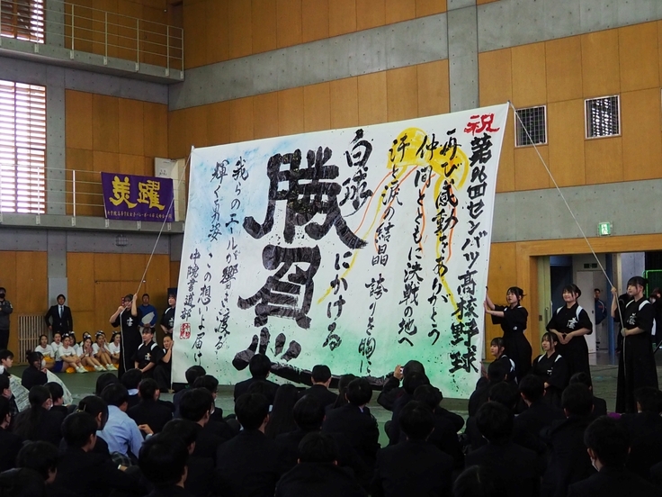 その後、生徒会による司会進行により、校内から『チアリーディング部』と『書道部』による応援パフォーマンスが披露されました。その他にも『吹奏楽部』が野球部の会場への入退場時の演奏を担当し、生徒代表として『生徒会』からは生徒会長による激励のメッセージが野球部に贈られました。