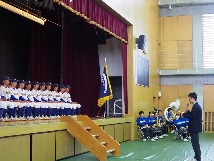 壮行会に先んじて、先ずは前回のレポートでもご紹介した選抜旗が、横田一弘校長から野球部の中村研心主将に託され、横田校長から激励のメッセージをいただきました。