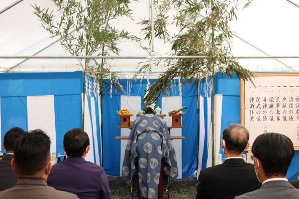 地元我孫子市の総鎮守である柴崎神社より神主様をお招きして、今回の学生寮建設に携わっていただく施工各社の代表の方々や、本学の役員・関係教職員等が参列し、今後の工事の無事進行を願って、厳かに祭事が執り行われました。