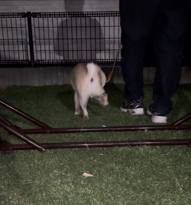現在、お散歩をする許可が出ておりますが、まだ走ったり速いスピードで歩くことは禁止されております。早く歩くとどうしても後ろ足が遅れてしまうため、スキップのような歩き方になってしまっています。そのため、ゆっくり足をきちんとあげられるように、2つの棒の間をきちんと足を上げてあるくというリハビリを毎日行っています。