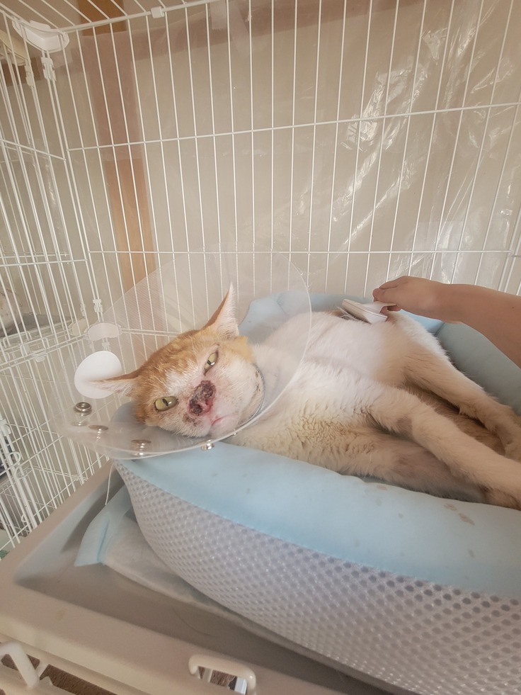 でも、手術後私の方を向いてチュールを少し舐めてくれた時は本当に嬉しかったし心から可愛いと思ったし、今どんどん患部も綺麗になってきて、お顔の毛も少しずつ生えてきて、見慣れたというのもあるのだと思いますが、全然ほんとに可愛いです。