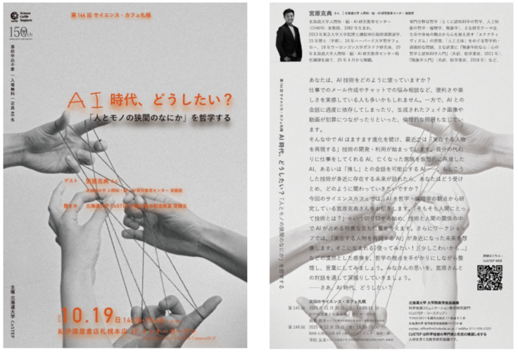 北海道大学 大学院教育推進機構 オープンエデュケーションセンター 科学技術コミュニケーション教育研究部門(CoSTEP)が主催する第144回 サイエンス・カフェ札幌「AI時代、どうしたい? 『人とモノの狭間のなにか』を哲学する」に、宮原克典准教授が登壇しました。