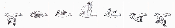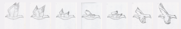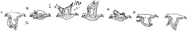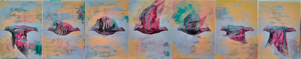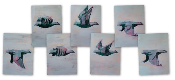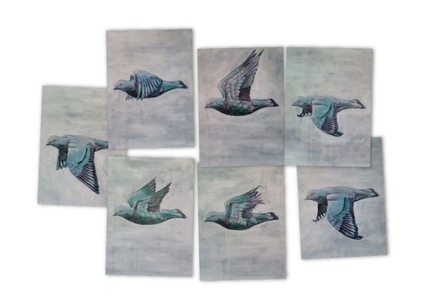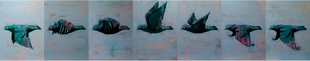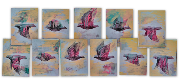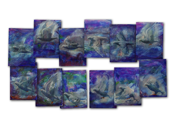 この作品群は、鳩が羽ばたく様子を私がつぶさに観察し、その姿を連続画として描いたものです。