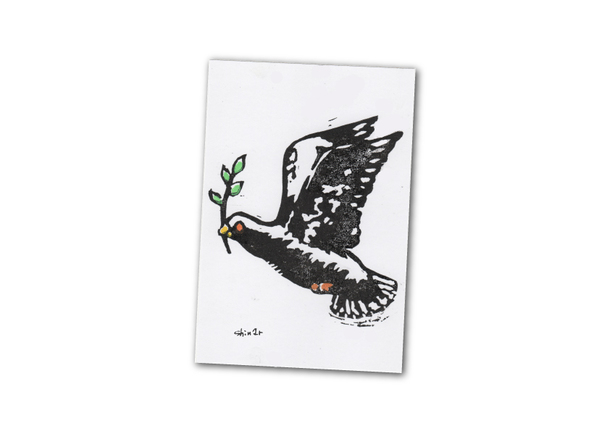 鳩をモチーフに、返礼品用としてあらたに描き下ろした図案の版画(ポストカードサイズ)です。50部限定のエディションが入ります。封筒に入れてお送りいたします。