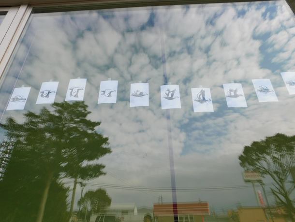 窓ガラスに66羽の鳩の版画を展示しています。合わせて13連の詩も展示しています。10か国壁画を描く中で、見聞きしたことを共有していただきたいという思いを込めています。