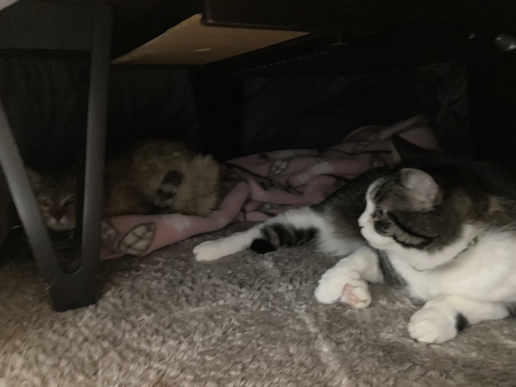 こむぎともケンカすることなく、ゆったりと距離をとって、こむぎが暖かい目で茶子を見守っている状態です。