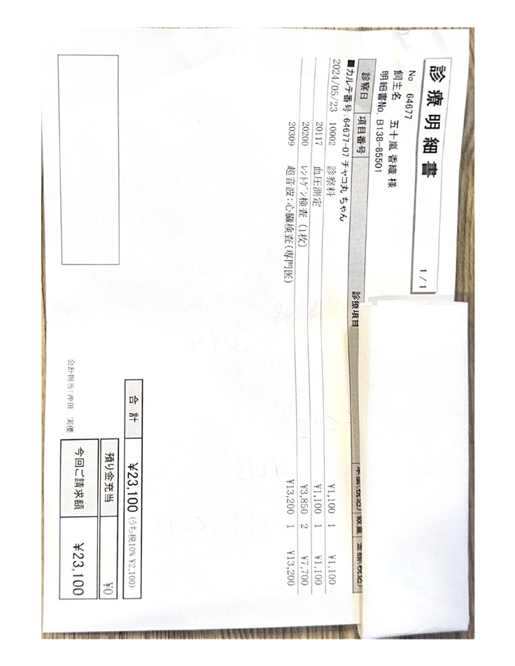 検査費(血圧測定/レントゲン検査/超音波:心臓検査/)×3ヶ月(予定)