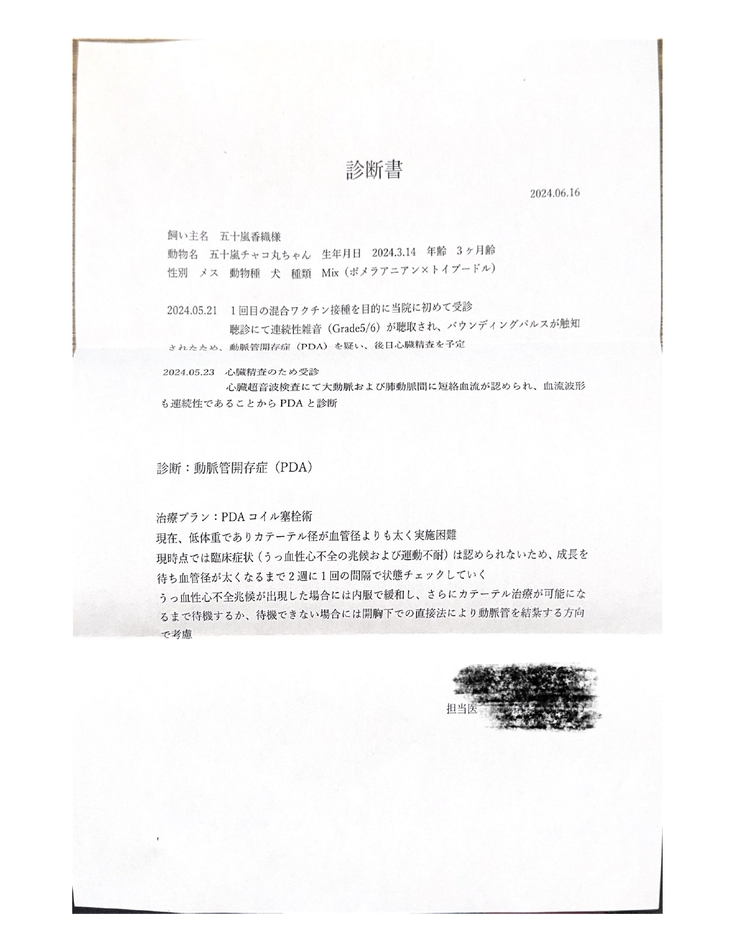 恐れていた通り、診断名は「動脈管開存症」という先天性心血管奇形の病気で、生まれつきの心臓病でした。