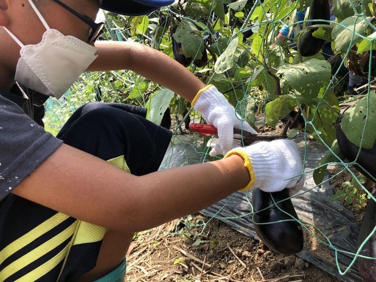 ネットの間にうまく手を入れて、なすを収穫します。