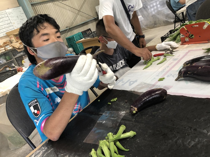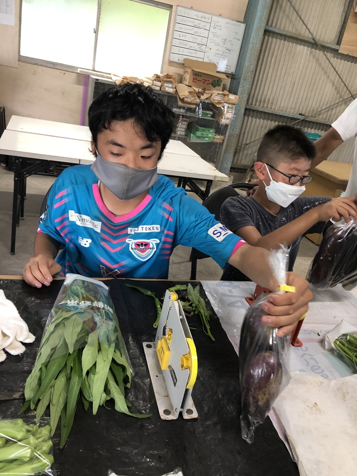 先程収穫したオクラ、茄子、空芯菜を丁寧に袋に詰め、テーピングをしていきます。
