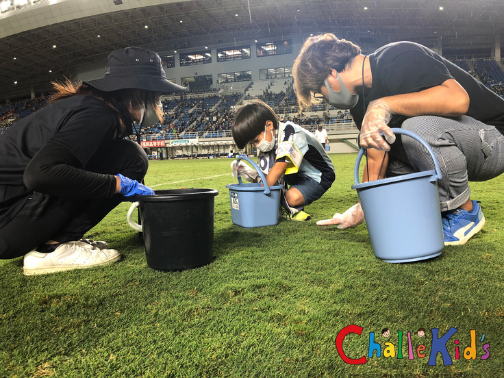 選手のお迎えに始まり、ロビーでの展示案内(お客様へのお声がけ)、ピッチでのスピーチ、見学、目土作業などなど、美しいピッチに立たせていただいての活動は感動的なものばかりでした。