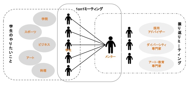 また、振り返りミーティングでは、全学生の1on1ミーティングについて、異なる知識・経験・感性を持つ複数のメンターで定期的に振り返り、質を高めています。
