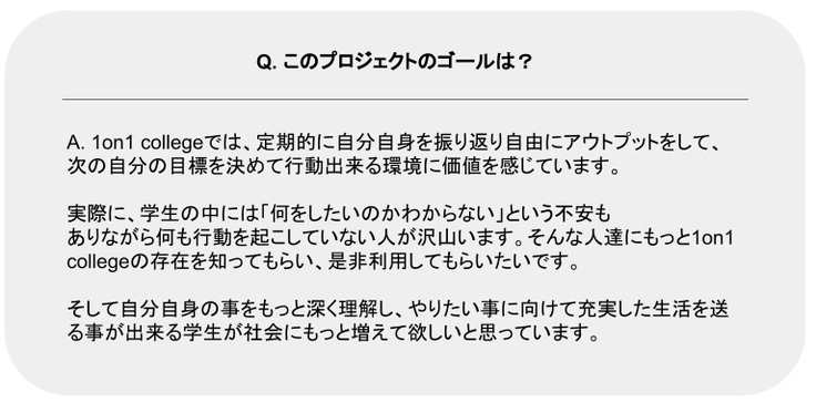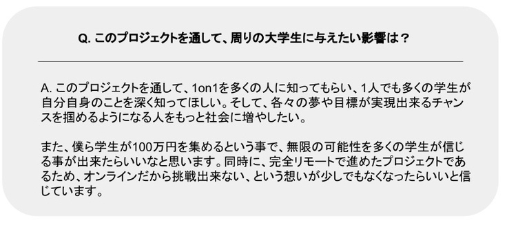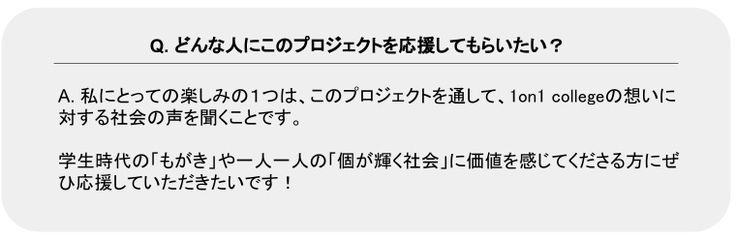 100万円を集めるということ、そして社会全体に1on1 collegeを認知してもらうことは、あくまでも私たちのゴールまでの手段です。より多くの学生がキャリア形成において1on1 collegeに参加することで、それぞれの個を存分に生かして社会に貢献できる仲間が増えることを私たちは切に願っています。