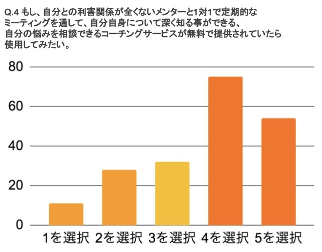Q.4 もし、自分との利害関係が全くないメンターと1対1で定期的なミーティングを通して、自分自身について深く知る事ができる、自分の悩みを相談できるサービスが無料で提供されていたら使用してみたい。