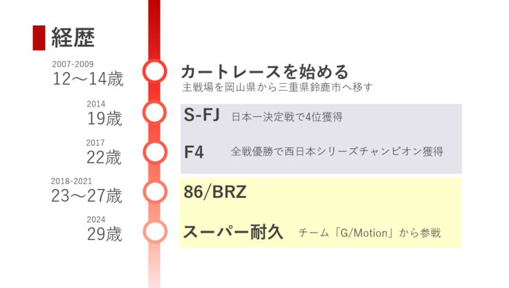 カートを始めたころから両親に頼りきりで、高校生からやっとアルバイトで稼げるようになりましたが、それでも無力でした。レースには想像以上にお金がかかり、時には新車に乗れず、中古車でレースに出場することもありました。大学生の頃初めてスポンサー活動を始め、地元岡山県の企業様をはじめ、個人の方にもたくさんご支援をいただき、これまでレースを続けてくることができました。