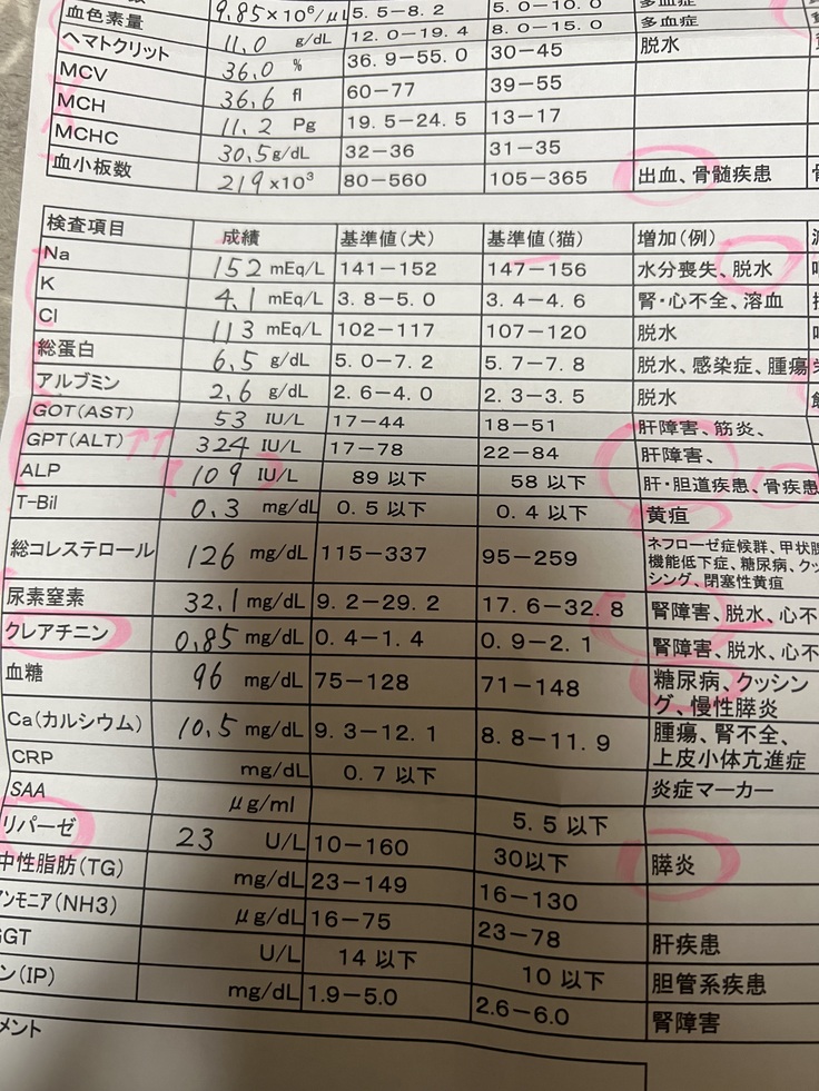 これから肝臓の薬をしばらく飲ませて、数値が下がれば一旦薬をやめてみて、それでまた数値が上がるようだと、一過性のものではない可能性が高いため、詳しい検査をして今後の治療を決めましょうとの事で...