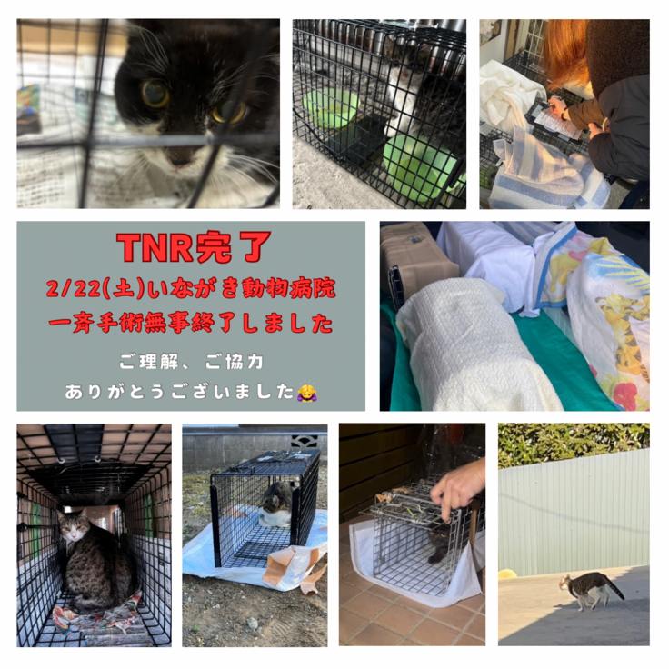 いながき動物病院越谷本院にて、どうぶつ基金無料さくら猫チケット行政枠を使用させていただき5匹の不妊手術と保護猫2匹の不妊手術とマイクロチップ装着をしていただきました。