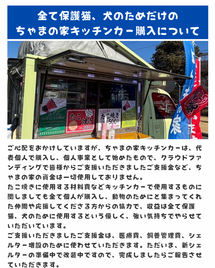 全て保護猫、犬のためだけのちゃまの家キッチンカー購入について