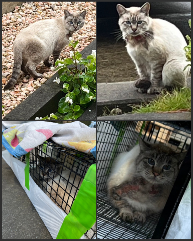 以前、アライグマの捕獲器に入ってしまったシャム柄の猫ちゃんを引き取ってくださる予定だった方がいらしたみたいで、私の知り合いから、もしシャム柄の猫が捕獲されたら連絡してほしいと写真をいたので、連絡をして捕獲したシャム柄の猫を見にきていただきました。