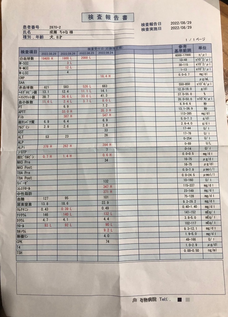 そして全身状態が悪く病院へ行った8/24の採血では、白血球が検出できないほど白血球が少なく、もう病気と闘う力もない程に弱ってしまっていました。
