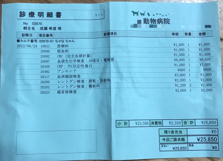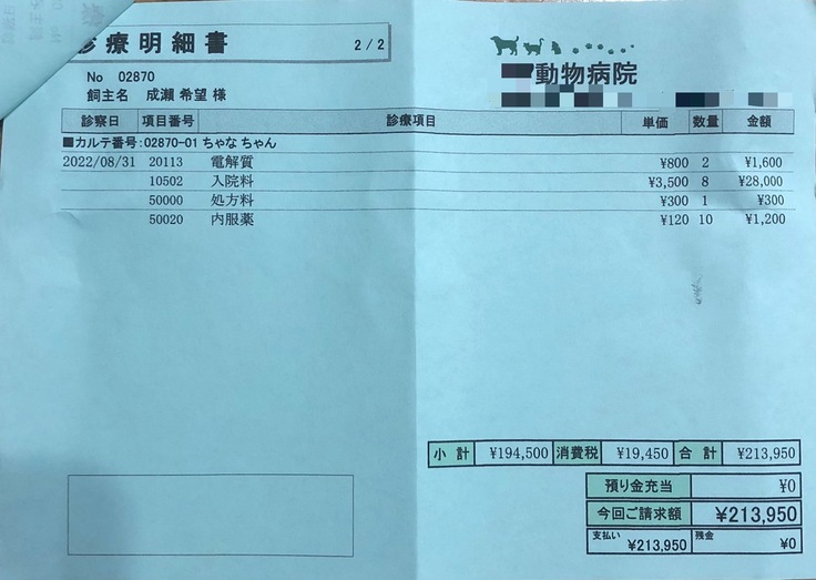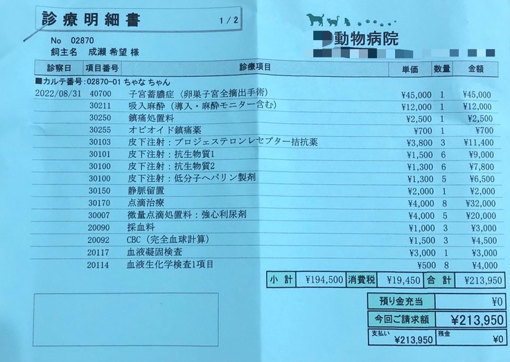 これまでに¥239,800の治療費がかかりました。これより先にも通院での抜糸等もあるのでまだ費用がかかる予定です。