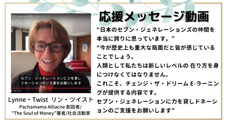 そして、このプロジェクトに向けて、『チェンジ・ザ・ドリーム シンポジウム』というプログラムを創り出したアメリカのNPO Pachamama Alliacne創設者/Soul of Money インスティテュート代表/世界的ファンドレイザーのリン・ツイストさんが、動画で応援メッセージを送ってくださいました。ぜひご覧ください!