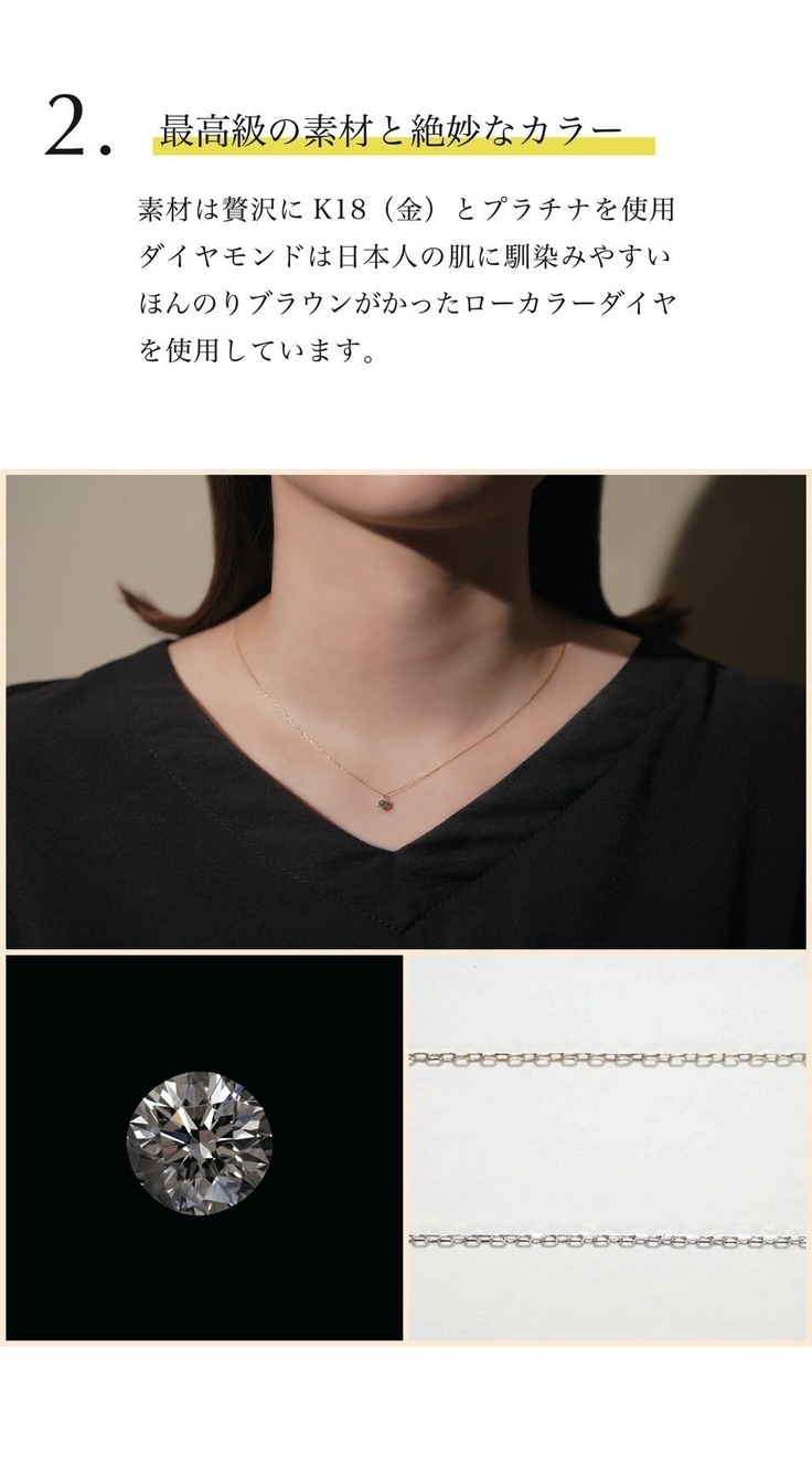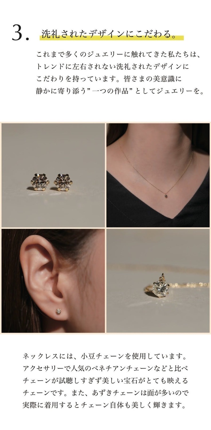 程よい大きさの天然ダイヤモンドを使用したシンプルなデザインのネックレスで、普段使いからオフィスと幅広いシーンにマッチする、永く愛用できるジュエリーです。