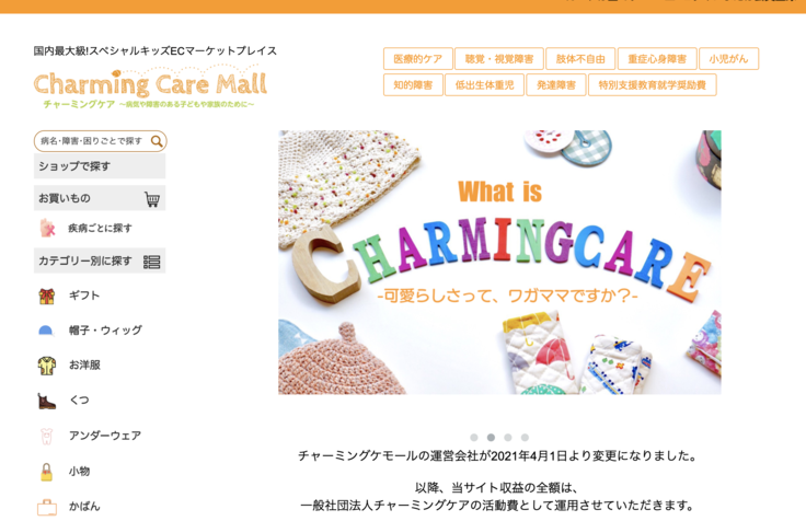 ●病児や障害児を支える療育施設や入院付き添いのための宿泊施設などへの物資応援として、ECマーケットプレイス「チャーミングケアモール」内でチャリティコンテンツを運用してきました。