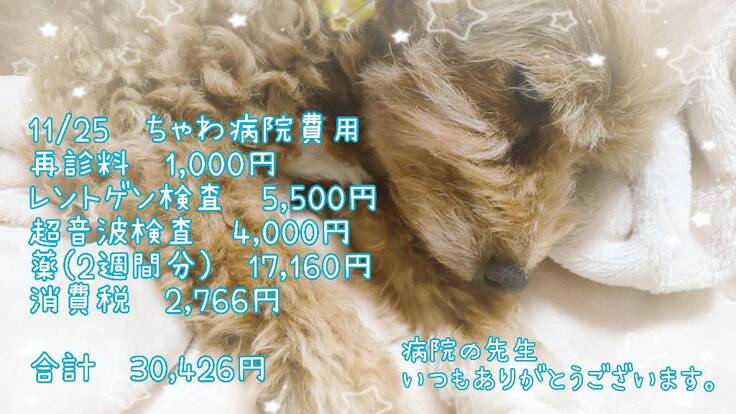 こちら↑は11月25日に普段のかかりつけ動物病院での通院検査費です。(手術を受ける病院とは別になります。)