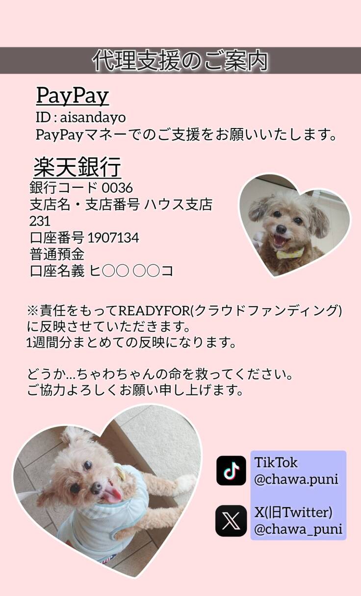 引き続き、ちゃわの命の為に温かいご支援、応援、拡散、よろしくお願い申し上げます。
