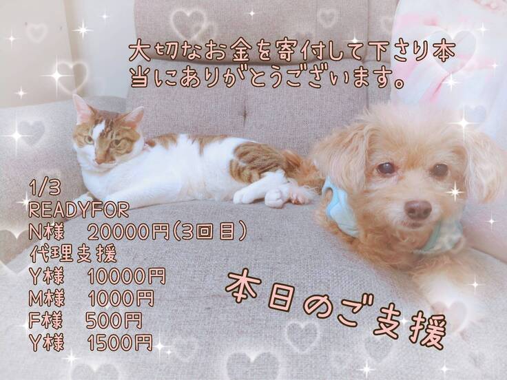 ご支援金は全て、ちゃわの手術費、入院費、通院費に充てさせて頂きますので、リターンに費用を掛けられず、申し訳ございません。
