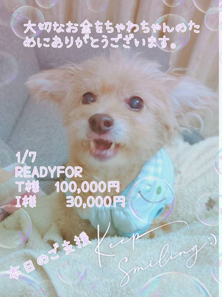 ご支援金は全て、ちゃわの手術費、入院費、通院費に充てさせて頂きますので、リターンに費用を掛けられず、申し訳ございません。