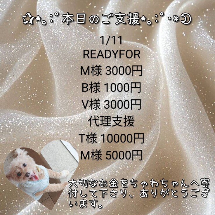 ご支援金は全て、ちゃわの手術費、入院費、通院費に充てさせて頂きますので、リターンに費用を掛けられず、申し訳ございません。