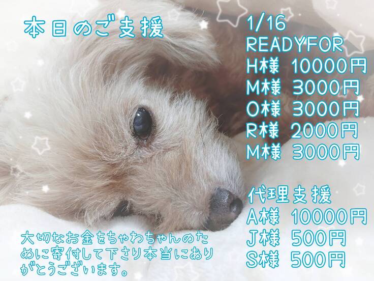 ご支援金は全て、ちゃわの手術費、入院費、通院費に充てさせて頂きますので、リターンに費用を掛けられず、申し訳ございません。