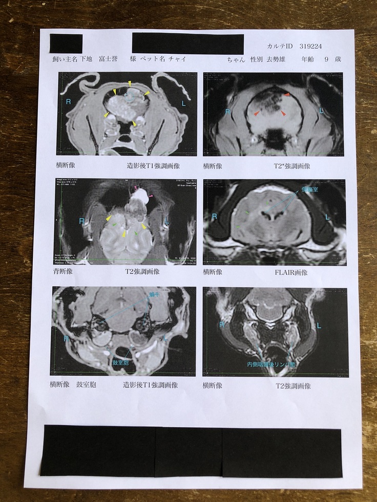 術前の麻酔後にMRI検査をしたところ、脳腫瘍が更に大きくなっていて(腫瘍が脳の半分まで大きくなっていたそうです)術中のリスクは以前にも増して高くなると言われました。