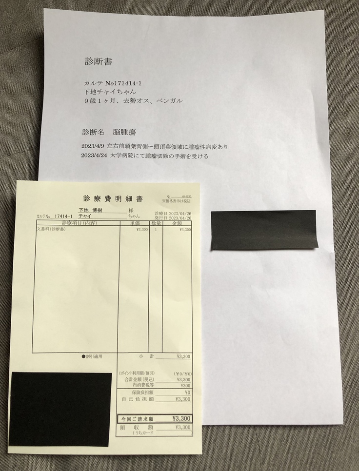 ページ上に掲載している診断書や治療明細などの資料は全て動物病院に掲載の許可を得ております。