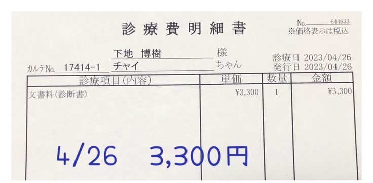プロジェクト立ち上げのため診断書が必要となり、かかりつけ動物病院にて出していただいた文書代の明細です。