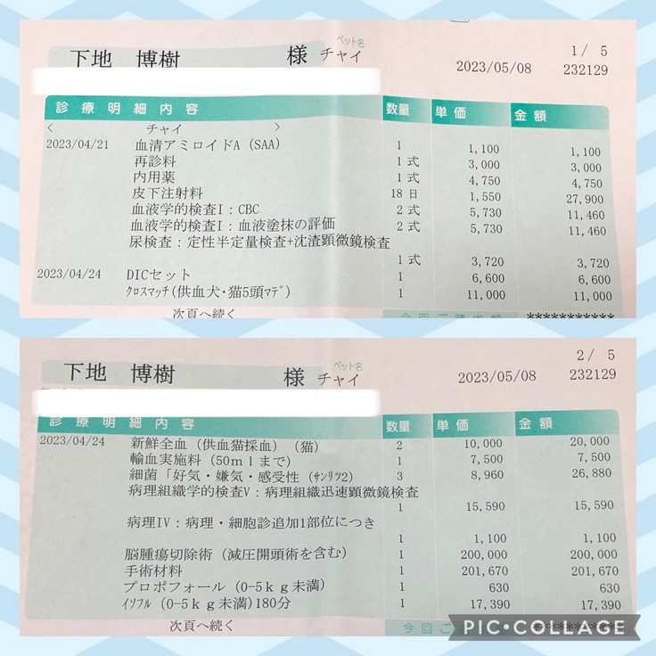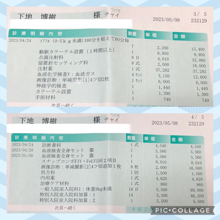 4/21〜の診療明細のご報告です。※4/21からチャイ入院(手術は4/24ですが、術前管理含めて早めの入院になりました)