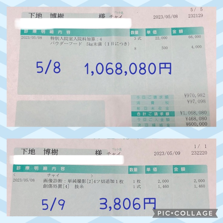 ※5/8日退院時に支払ったものに、不備があったとのことで、5/9の明細は追加でお支払いに行ったものです。