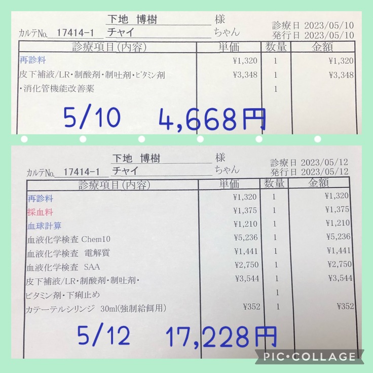 これ以降も水を飲まなかったので、2.3日おきに通院または自宅にて皮下点滴となり、チャイの通院は続きました。
