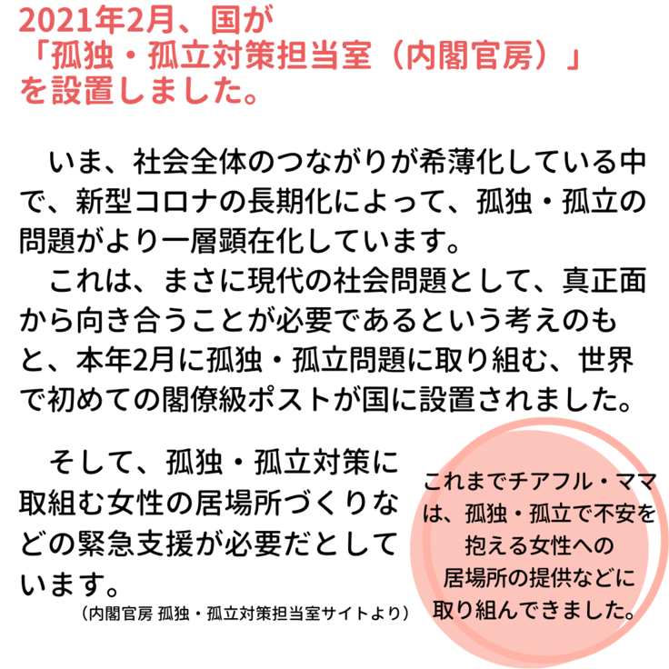 この度、チアフル・ママは、女性の居場所づくり「つながりサポート事業」として、ご賛同いただける方々によるクラウドファンディングにより、孤独・孤立で不安を抱える女性のために、