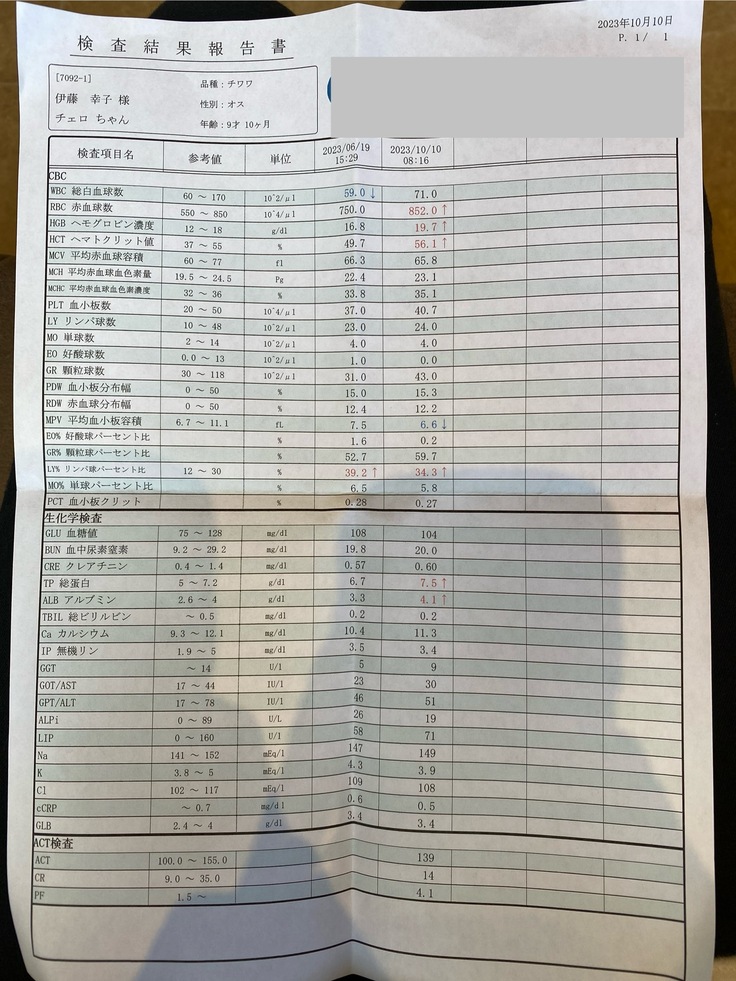 血液検査は、数値が基準値より高くなっている項目がありますが、心配しなくて良いとのこと。